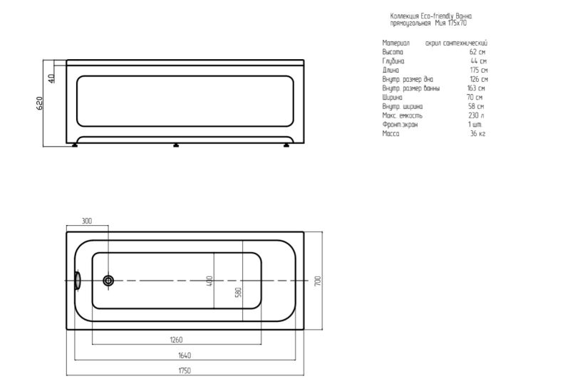Акриловая ванна АКВАТЕК EFVA175 Мия 175x70 см