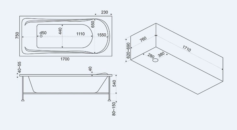 - Размеры: 1700 х 750 мм
