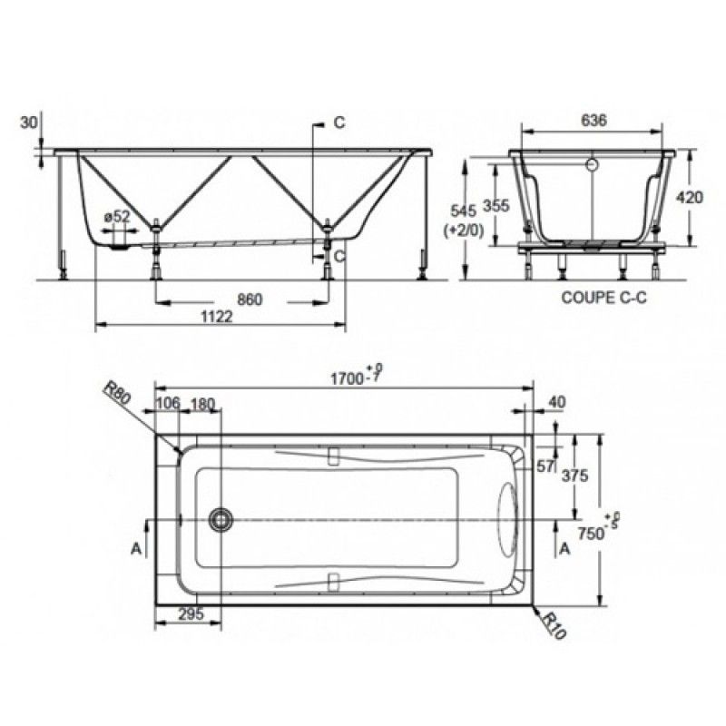 Смягченные углы с внутренней стороны чаши ванны облегчают уход.РАЗМЕРЫ :170 x 75 x 42 см