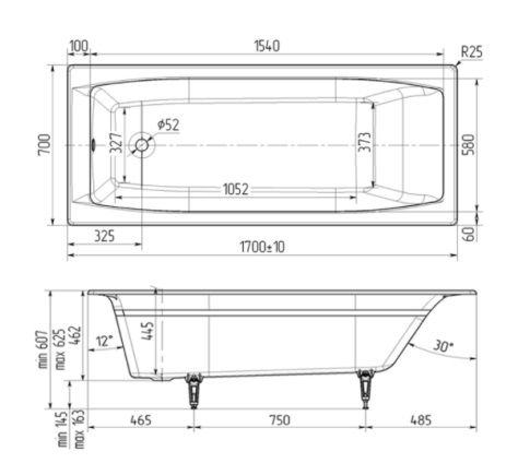 Прямоугольная чугунная ванна. Современный дизайн, глубокая чаша и широкое дно.Длина, мм 1700±10