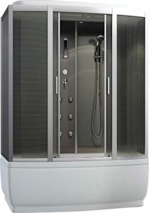 фронтальные стекла матовые фактурные задние стекла матовые «серебро» центральная панель стекло матовое «серебро» хромированный алюминиевый профиль регулируемые ролики хромированные ручки для дверей 4-х режимный смеситель ручная лейка на штанге 6 гидромассажных форсунок верхняя лейка «тропический душ» стеклянная полка пульт управления с функциями: радио, свет, вентилятор излив для набора воды в поддон слив-перелив с сифоном