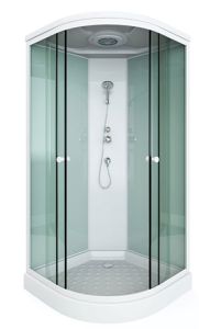поддон низкий 15см фронтальные стекла: матовые фактурные задние стекла : белые матовые задняя панель : белый пластик белый алюминиевый профиль регулируемые ролики белые ручки для дверей 2-режимный смеситель ручная лейка слив с сифоном крыша с верхней лейкой