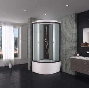 Поддон акриловый высокий 38см(сиденье на поддоне),глубина 23 см,сифон с гофрой,экран съемный, профильчерный, центральная панель черная, задние стенки закаленные, белые,крашенные,передние стекла закаленные,прозрачные,смеситель 2-х режимный,ручной душ, полочка.