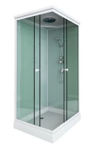 поддон низкий 15см (прямоугольный) фронтальные стекла: матовые фактурные задние стекла : белые матовые белый алюминиевый профиль регулируемые ролики белые ручки для дверей 2-режимный смеситель ручная лейка (на стенке ) слив с сифоном крыша с верхней лейкой