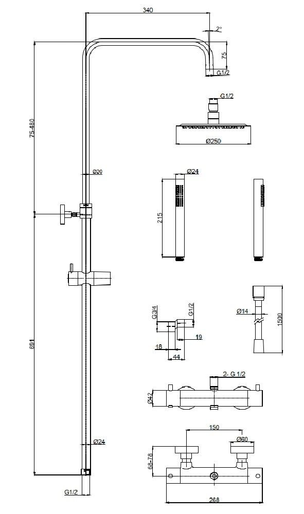 состоит из: верхний душ, ручной душ, термостатический смеситель для душа, штанга для душа, держатель для душаверхний душ 250 1jetразмер душевого диска: 250 x 250 ммтип струи: Rainдушевая лейка 24 мм, 1 режима струишарнирное соединение: регулируемый угол верхнего душадлина держателя для душа: 340 ммдержатель для ручного душа регулируемый по высотеповоротный держатель для душавид монтажа: внешний монтажсоединительная резьба G ½межосевое подключение 150 мм ± 12 ммподъемная труба может быть укорочена по высоте 75-480 ммИталия2 года гарантии