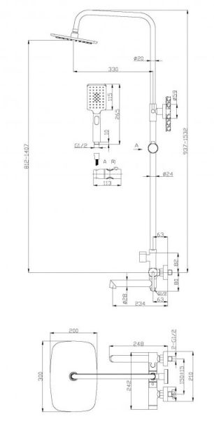 Оснащение: эксцентрики, дивертор, душевой шланг, душевая лейка, верхний душ, смеситель с изливом для ванны