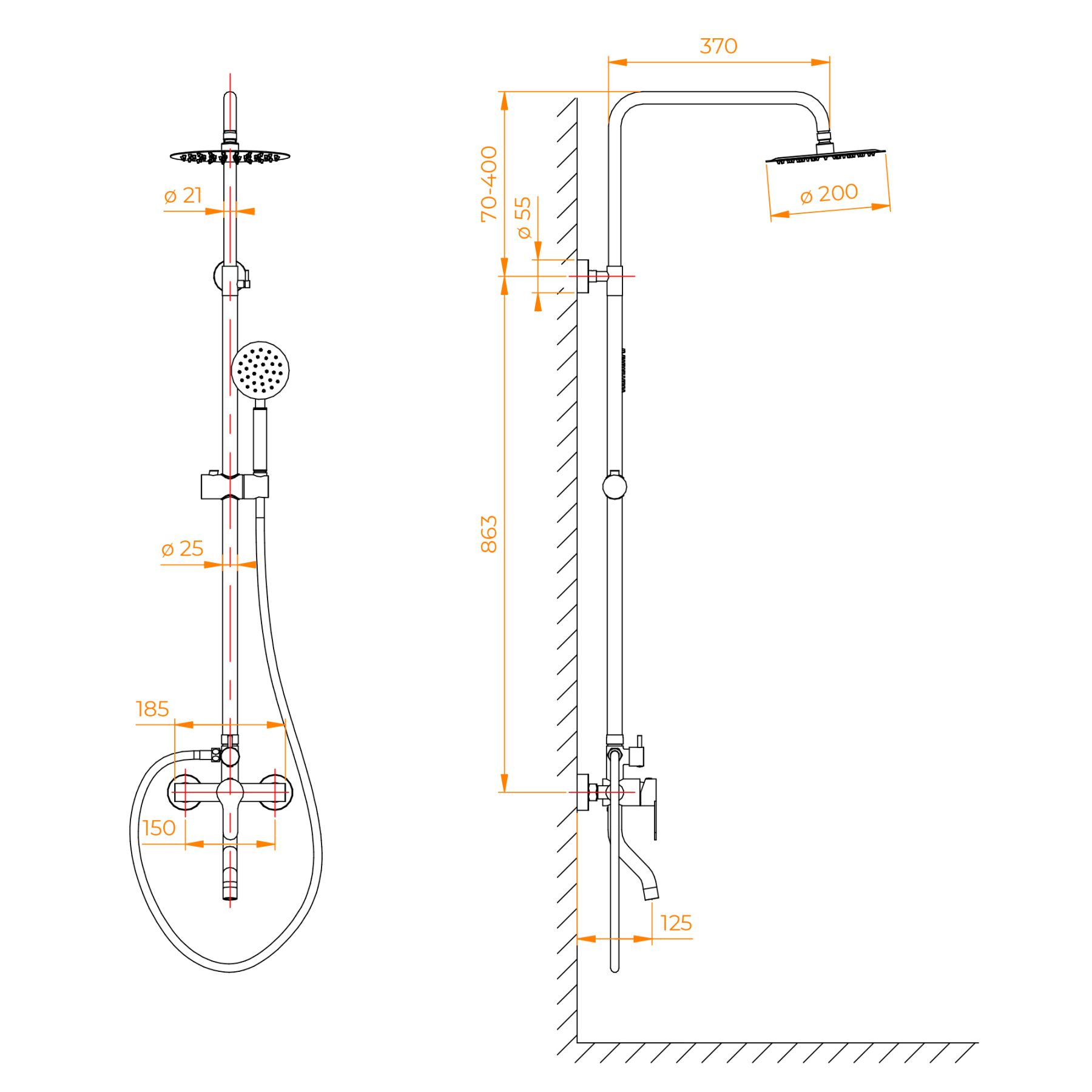 - Стальная штанга с регулировкой высоты головного душа