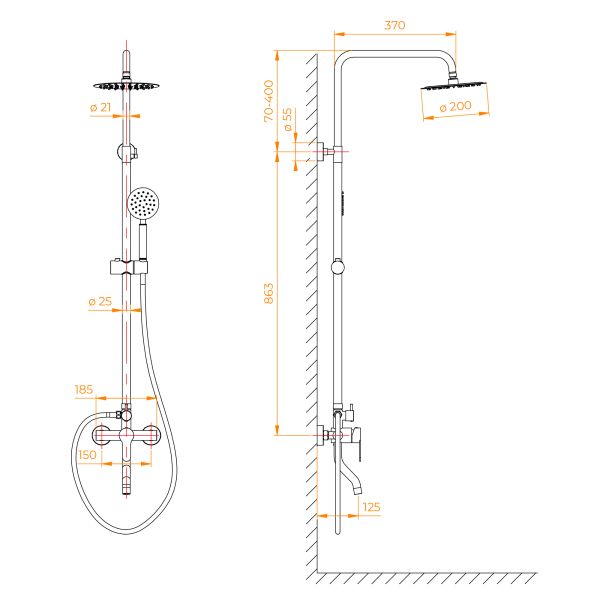 • Форма верхнего душа: круглая