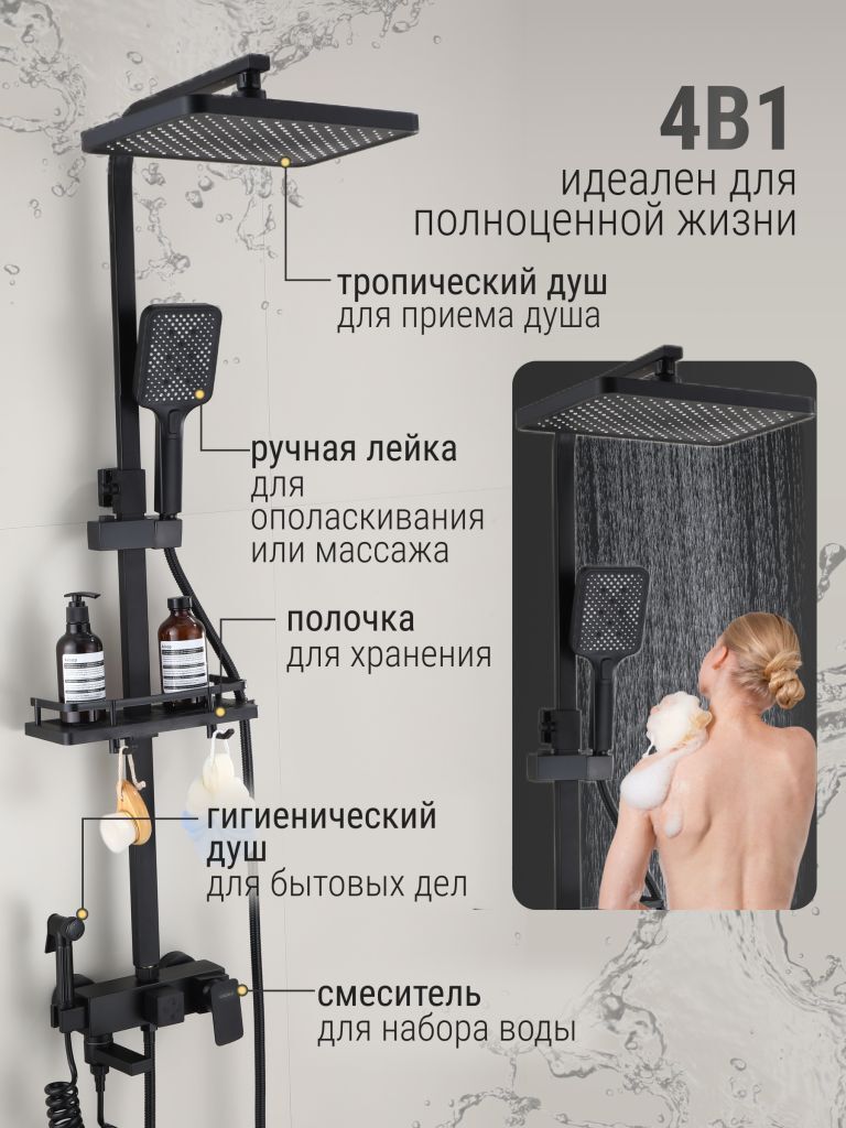 Душевой комплект содержит все необходимое для монтажа. Кроме того, наша душевая стойка черная имеет простой и быстрый монтаж, благодаря чему вы сможете установить ее самостоятельно без привлечения специалистов. Это позволит сэкономить время и деньги, а также получить удовольствие от процесса создания своего уютного уголка в ванной комнате.