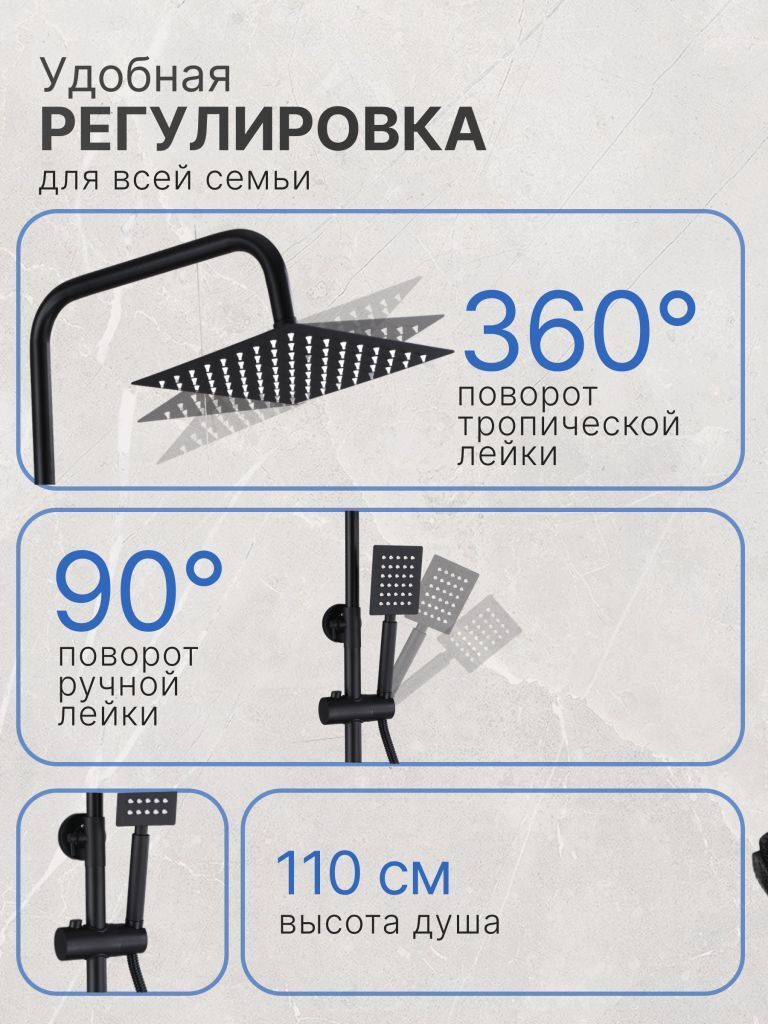 Душевой гарнитур содержит все необходимое для монтажа. Кроме того, наша душевая стойка хром имеет простой и быстрый монтаж, благодаря чему вы сможете установить ее самостоятельно без привлечения специалистов. Это позволит сэкономить время и деньги, а также получить удовольствие от процесса создания своего уютного уголка в ванной комнате.