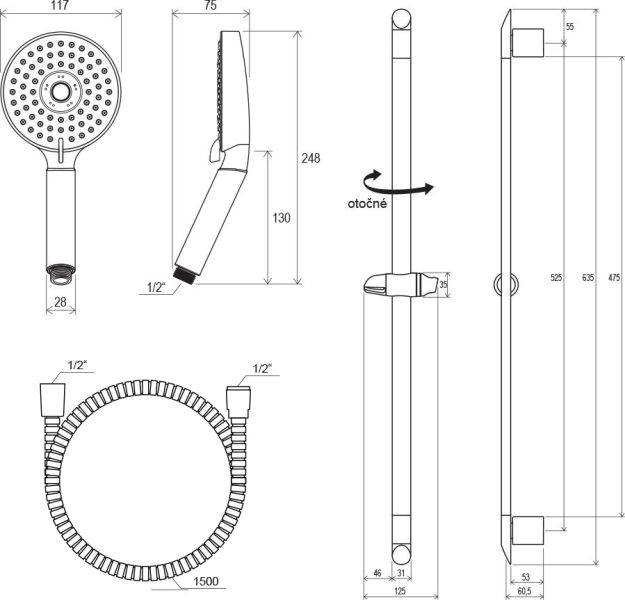 • размеры: шланг из прочного пластика 150 см, лейка с 3 функциями диаметром 118 мм, подвижный душевой держатель 63 см