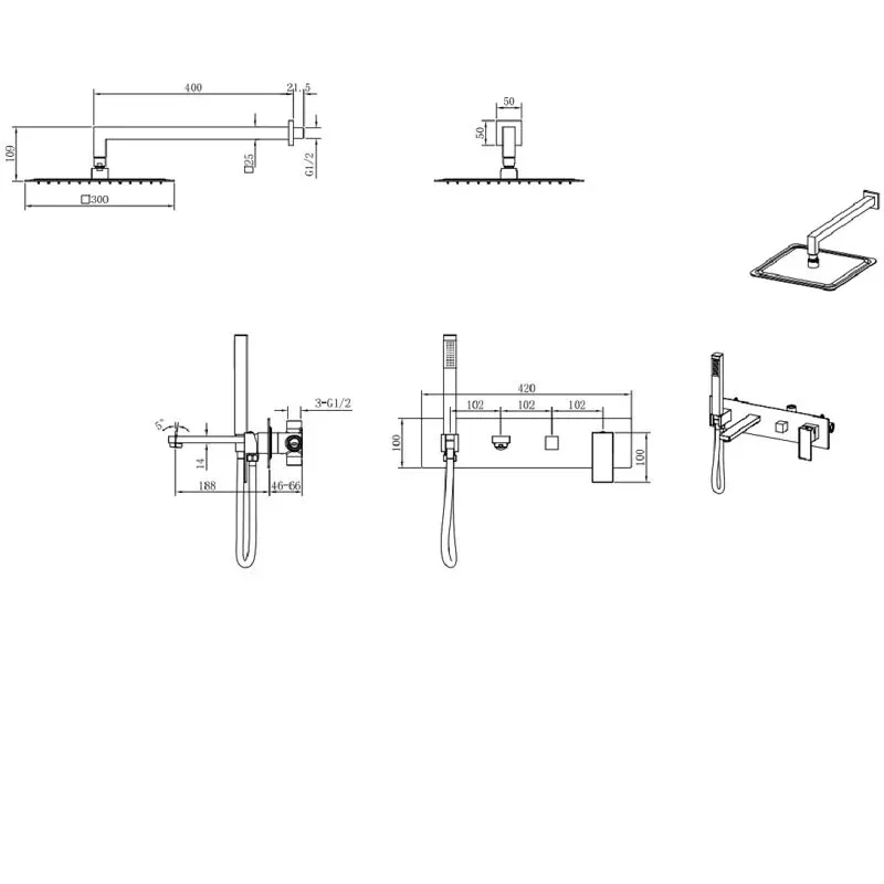• Размер верхнего душа 300х300 мм.
