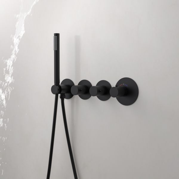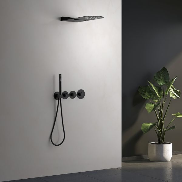 Черная сантехника становится все более популярной для ванных комнат из-за спообности расставлять акценты.Душевая система с термостатом Timo Saona 2350 относится к премиальному сегменту, предназначена для монтажа в полой или твердой стене. Термостатический картридж поддерживает стабильную температуру воды, обеспечивая максимально комфортные условия для принятия водных процедур. Настенный душ с двумя режимами позволяет принимать водные процедуры в зависимости от настроения. Регулируя напор воды можно получить массажное воздействие различной интенсивности. Используя режим "каскад"- получают седативное (успокаивающее) воздействие на затылочную часть головы или шейный отдел. Основные преимущества встроенной системы: элегантный внешний вид, все коммуникации и крепления спрятаны в стену, снаружи видны только декоративные элементы. Установить встроенную систему можно в любом месте. Использовать такой смеситель очень удобно, регулировка температуры воды осуществляется ручкой термостата (расположена справа). Переключение режимов "каскад", "тропический душ", "ручной душ" и увеличение напора осуществляется поворотом ручек диверторов расположенных слева от термостата. В положении ручек диверторов в положение 12:00 (смеситель выключен). Смеситель может работать в нескольких режимах одновременно"каскад"+"ручной душ", "тропический душ"+"ручной душ". Сложностей монтажа не возникает при установке элементов душевой системы опытным сантехником. Внимательно изучите инструкцию по монтажу и эксплуатации. Черная сантехника требует бережного ухода.