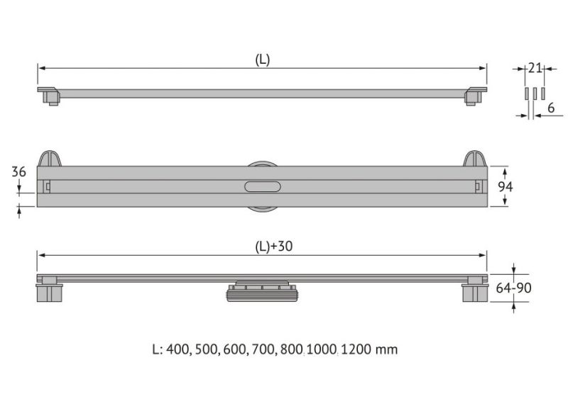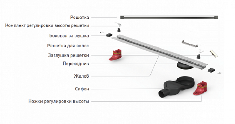 Решетка и декоративные заглушки, нержавеющая сталь AISI 304Комплект регулировки решетки по высоте от 8 до 25 ммСетка для волос, пластикКомплект гидроизоляцииЖелоб водосток, нержавеющая сталь AISI 304Монтажная заглушка, пенопластРегулируемые по высоте ножки, пластикСамопромывной S-образный сифон PPГоризонтальный выпуск D50 H60, пропускная способность 42л/мин, монтаж 360°Монтажный ключ, пластик