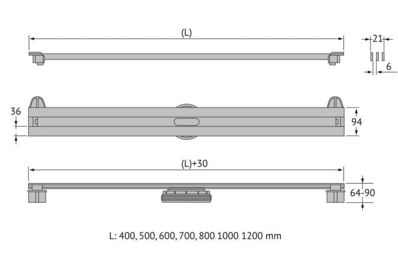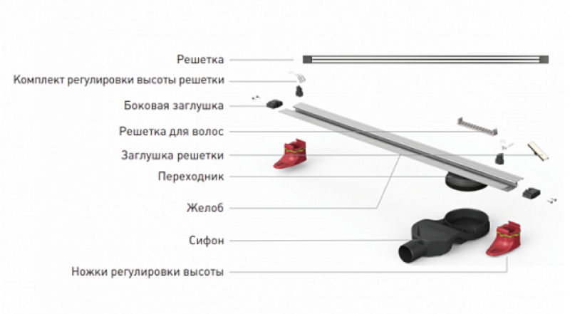Решетка и декоративные заглушки, нержавеющая сталь AISI 304Комплект регулировки решетки по высоте от 8 до 30ммСетка для волос, пластикКомплект гидроизоляцииЖелоб водосток, нержавеющая сталь AISI 304Монтажная заглушка, пенопластРегулируемые по высоте ножки, пластикСамопромывной S-образный сифон PPГоризонтальный выпуск D50 H60, пропускная способность 42л/мин, монтаж 360°Монтажный ключ, пластик