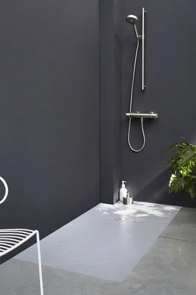 - Ультратонкий поддон для душевого пространства без внутреннего бортика, но с небольшим уклоном, достаточным для стекания воды в направлении слива