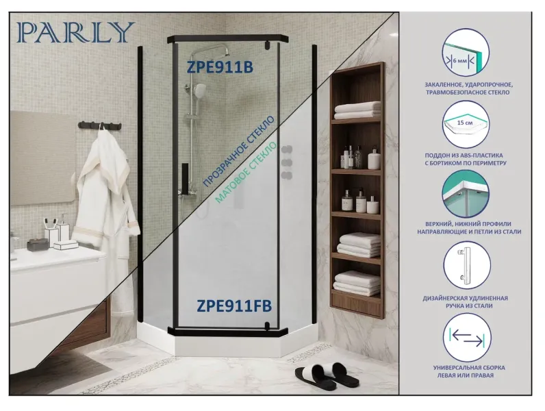 Душевое ограждение ZPE911FB с поддоном (90х90х200) бренда PARLY - идеальное решение для любой ванной комнаты. Красивая трапециевидная форма, яркие цветовые акценты, универсальная ориентация и современный дизайн уголка, позволит ему прекрасно вписаться в любой интерьер.