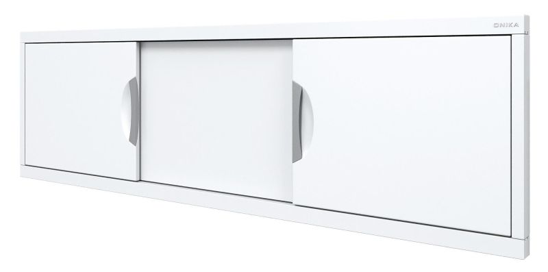 Конструкция имеет три подвижные раздвижные двери из МДФ, покрытых высокоглянцевой белой пленкой. Две боковые дверцы с врезными хромированными металлическими ручками.
