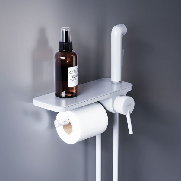 Гигиенический душ Damixa Jupiter со смесителем и полкой, белый 773500200Современное решение для вашего удобства и гигиены теперь в новом исполнении: смеситель с гигиеническим душем отличается простотой и комфортом в использовании, а еще он выглядит невероятно стильно в новом белом цвете. Самое практичное гигиеническое решение: смеситель оснащен удобной полочкой, на которой поместится все, что необходимо под рукой, и держателем для туалетной бумаги. Смеситель с гигиеническим душем имеет компактный размер и монтируется непосредственно в стену, что помогает установить его даже в небольших санузлах. Смеситель оборудован ручкой-стиком, которая удобно ложится в руку и гарантирует комфортное использование гигиенического душа. Керамический картридж Light Flow обеспечивает плавное управление ручкой смесителя и оптимальную регулировку температуры и мощности потока.