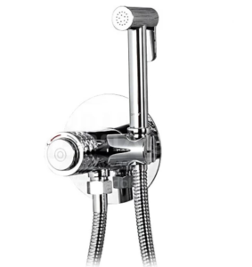 Смеситель встраиваемый Gappo G7288 с гигиеническим душем - с кнопочным управлением. Регулировка температуры осуществляется поворотом рельефной головки смесителя. Модель изготовлена из латуни с хромированным покрытием. Гигиеническая лейка крепится на корпусе смесителя, с противоположной стороны расположен крючок для принадлежностей. Душевой шланг в комплекте.