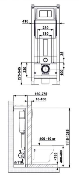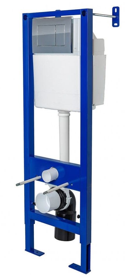 Узкая рама шириной 41 см.Металлический каркас, окрашенный антикоррозийной эмалью.Расчетная нагрузка 400кг. Объём резервуара воды 10 л с тепло- и шумоизоляцией.Подвод воды внутрь резервуара (G1/2 наружная).Объем смыва 3/6 литра с возможностью регулировки.Управление механическое, две кнопки.Межосевое расстояние под шпильки для подвеса унитаза 18 и 23 см. Полный комплект для установки включает в себяшумоизоляционную прокладку и лекало для монтажных отверстий.