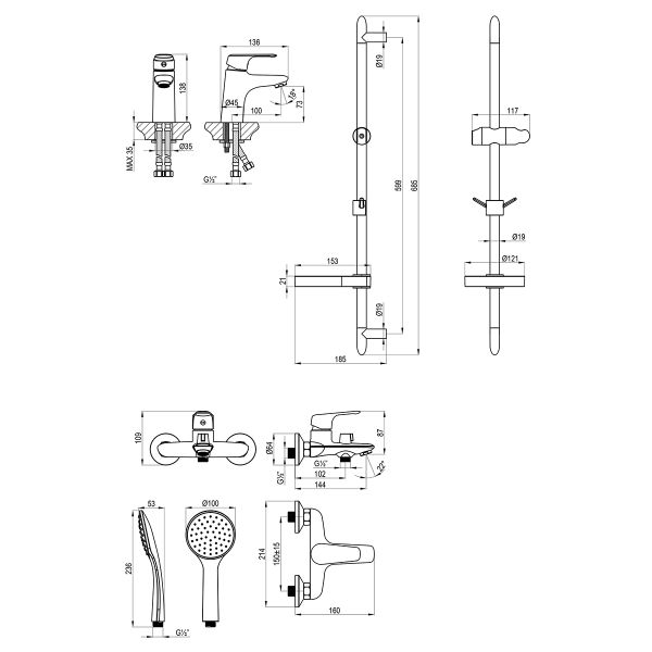 - Аксессуары в комплекте: 1-функциональная лейка Ø100×236 мм, душевой шланг 1,5 м