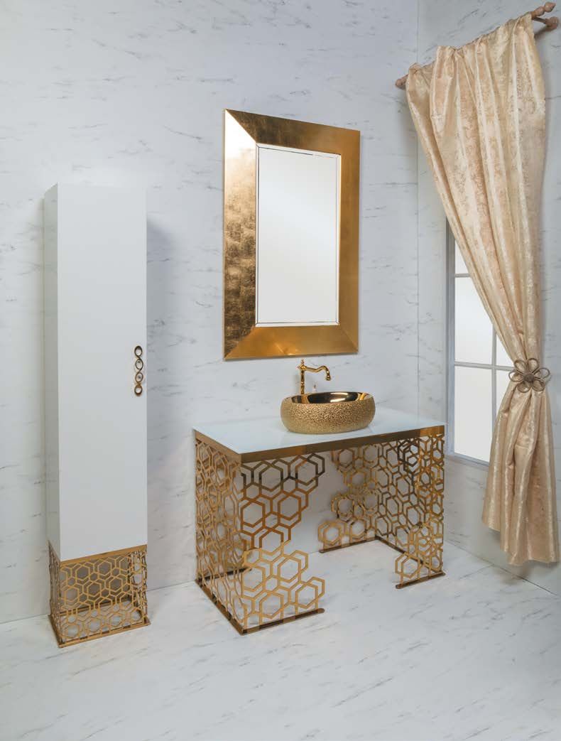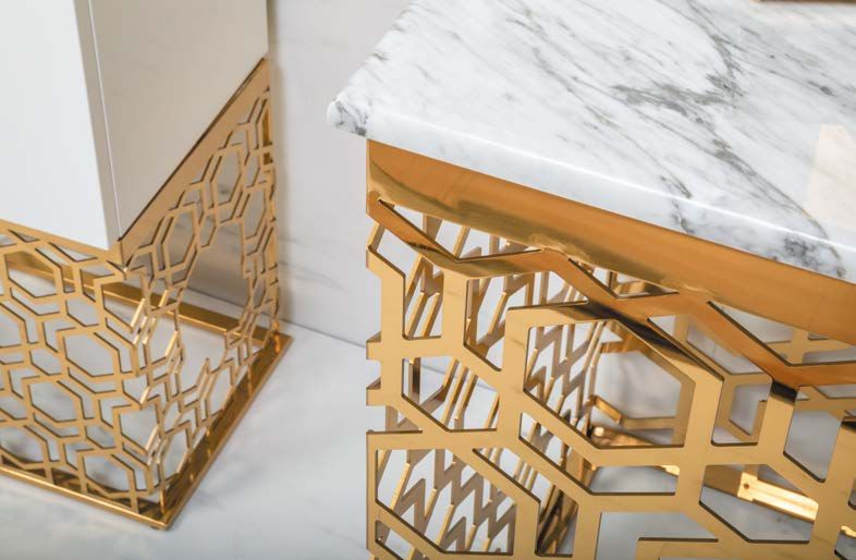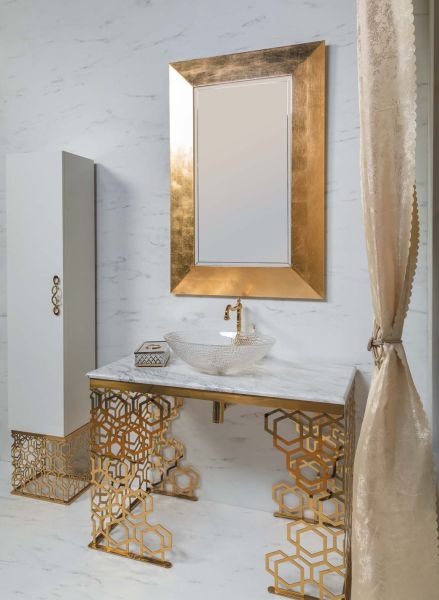 Консоль с раковиной Aura шириной 110 см цветом золото.Консоли произведены из нержавеющей стали благодаря чему стойки к коррозии. Гальваническое покрытие исполнено в цветах хром и золото. Можно выбрать столешницу из мрамора, хрустального каленого стекла в различных цветовых исполнениях, и Solid Glass (передовой материал, в состав которого входит мраморная крошка и стекло). Раковины-чаши выполнены из Corian, которыми можно дополнть консоли, хрустального стекла, керамики. Хорошим дополнением к консолям являются пеналы ArmadiArt, а также сифоны, клик-клаки и смесители Boheme.Мебель можно дополнить пеналом и зеркалом