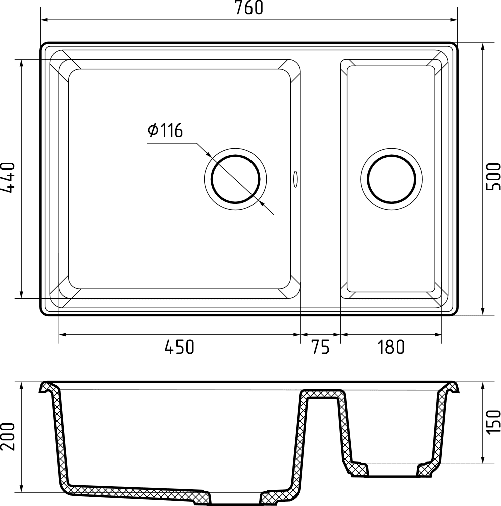 Размер чаши 2: 180 х 440 х 150 мм