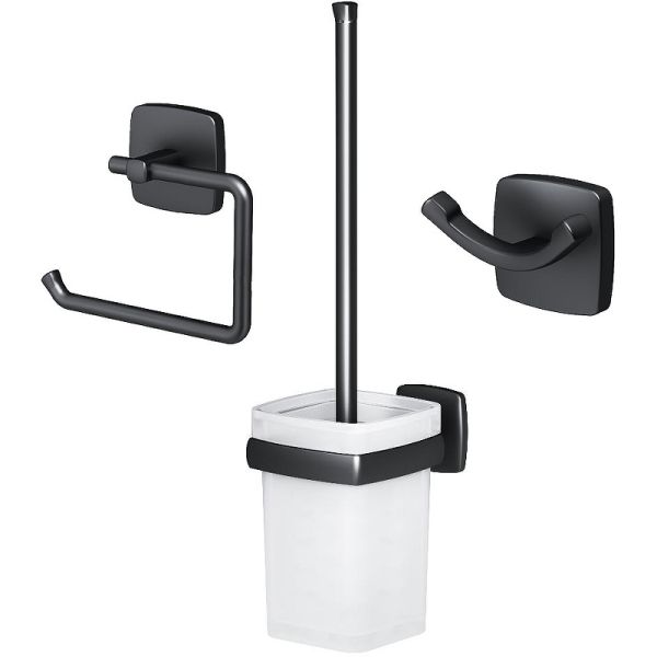 Набор аксессуаров для ванной AM.PM Gem AK90T2003B черныйНабор дизайнерских аксессуаров от AM.PM станет идеальным завершением образа современной туалетной комнаты. Занимая минимум места в пространстве, аксессуары Gem помогут рационально организовать место для хранения и станут стильными акцентами в интерьере. В комплекте: двойной крючок для полотенец, держатель для туалетной бумаги, стойка с туалетной щеткой. Дерзкая и стильная коллекция Gem в черном цвете превращает даже простые аксессуары для ванной комнаты в классные дизайнерские детали, которыми хочется пользоваться каждый день. Форма аксессуаров повторяет линии смесителей коллекции, подчеркивая единую концепцию дизайна. Премиальные детали: массивное матовое стекло прямоугольной формы. Лазерная обработка стыков – ультратонкий шов и 100% защита от влаги.