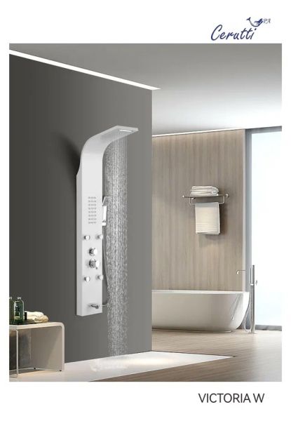 Комфорт ванной комнаты формируется современными элементами обустройства помещения. Поэтому для создания уютной атмосферы необходимо внимательно отнестись к выбору сантехнического оборудования. Сделать вашу ванную комнату не только эргономичной, но и функциональной, поможет душевая панель.Душевые панели становятся все более популярными, так как предлагают роскошные SPA процедуры в комфорте вашей собственной ванной комнаты. Эти изящные и стильные устройства обладают целым рядом функций, которые призваны улучшить ваши впечатления от принятия душа.Также душевые панели являются отличным решением для помещений любых размеров: они компактные, функциональные, удобные в управлении и эксплуатации. Душевые панели не требуют трудоёмкого ухода и являются отличной альтернативой классическим смесителям с ручной лейкой, душевым стойкам или кабины с гидромассажем.Трендовые душевые панели бренда Ceruttispa отличаются высоким качеством, современным дизайном, многофункциональностью, надежностью и долговечностью. Они будут прекрасно смотреться в любом интерьере, а качественный материал исполнения - нержавеющая сталь - прослужит долго, сохранив свои эстетические характеристики. Удобная и многофункциональная душевая панель VICTORIA W предназначена для установки внутри душевых уголков, ограждений, а также совместно с ванной.Конструкция панели включает в себя верхний и ручной душ, а также держатель для аксессуаров. Излив оснащен аэратором, который снижает расход воды легко очищается.Внимание! Производитель оставляет за собой право вносить изменения в конструкцию и комплектацию моделей без предварительного уведомления!Особенности: