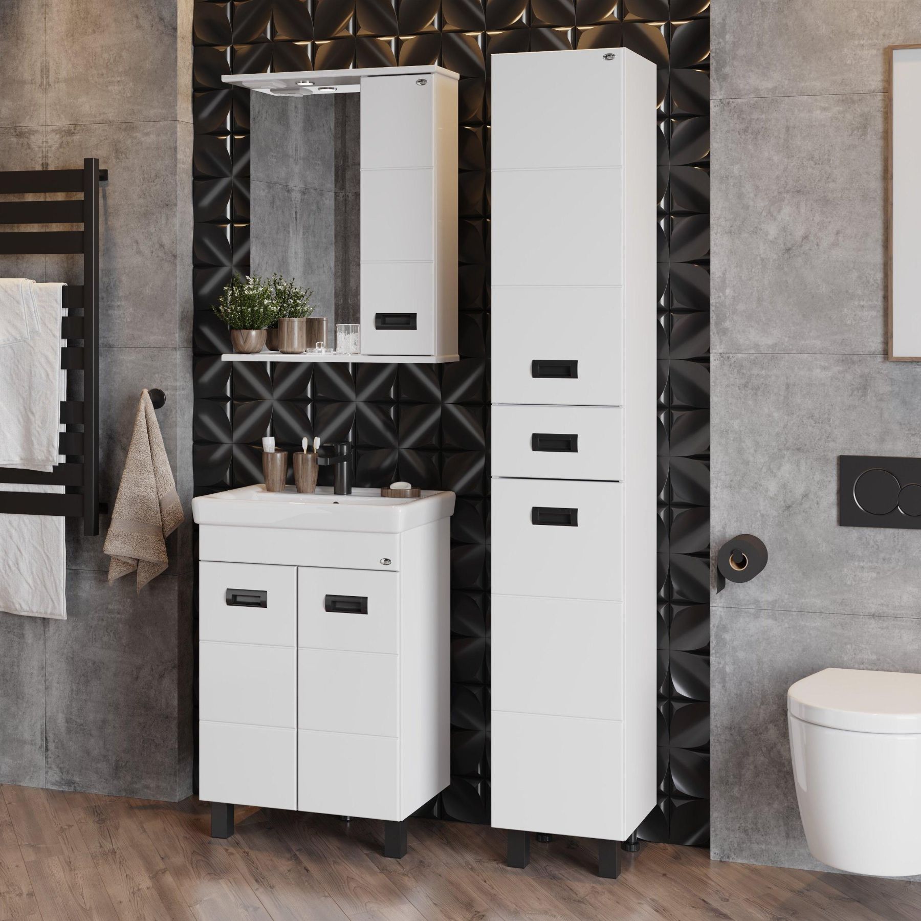 Глянцевый белый цвет фасада контрастирует с черной матовой фурнитурой, а ненавязчивая горизонтальная фрезеровка дополняет образ стильной и современной мебели.