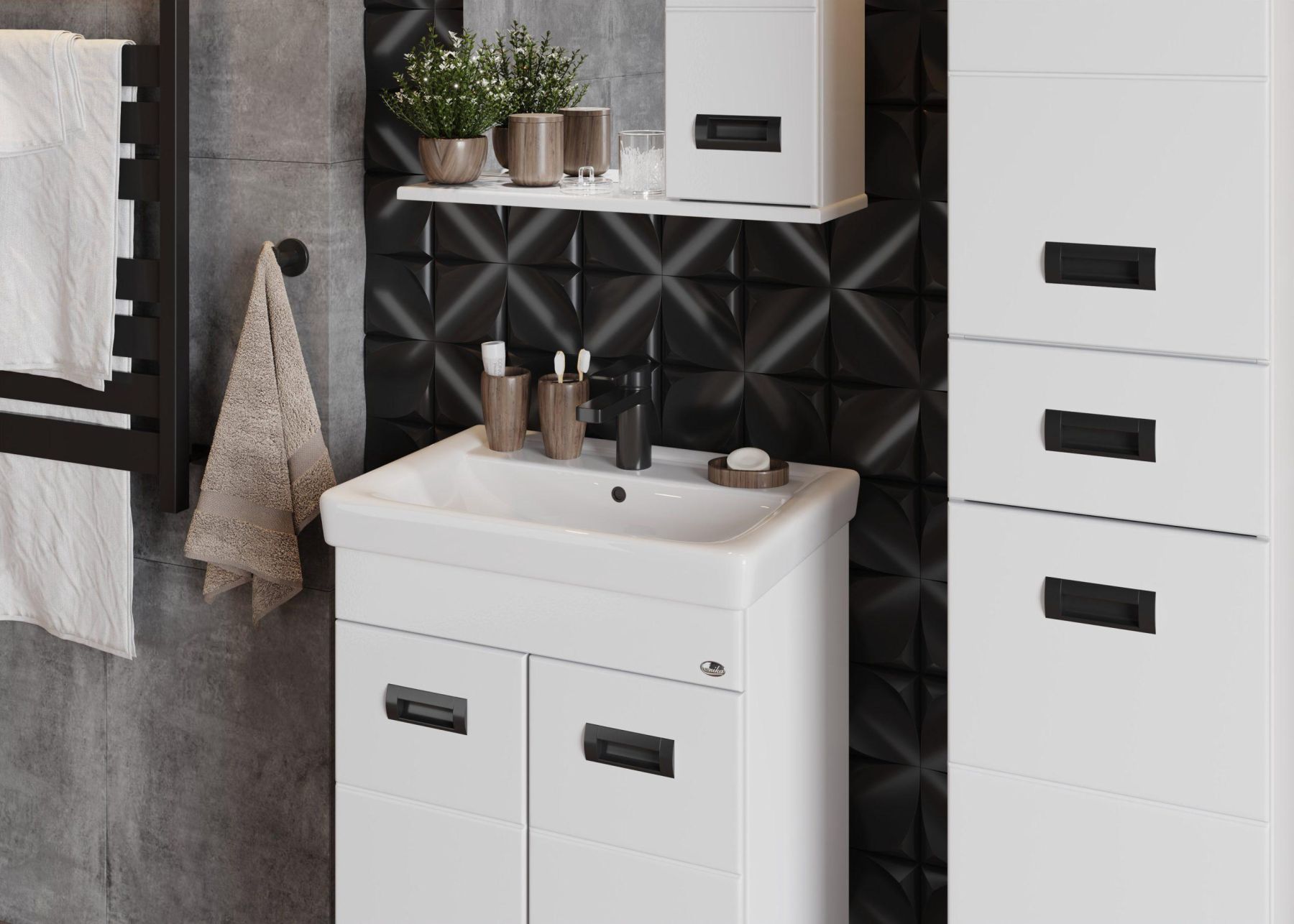 Удобный ящик с направляющими полного выдвижения посередине пенала и два больших отделения, разделенные горизонтальными полочками, за распашными дверями с механизмом плавного закрывания - отличное место для хранения необходимых вещей.
