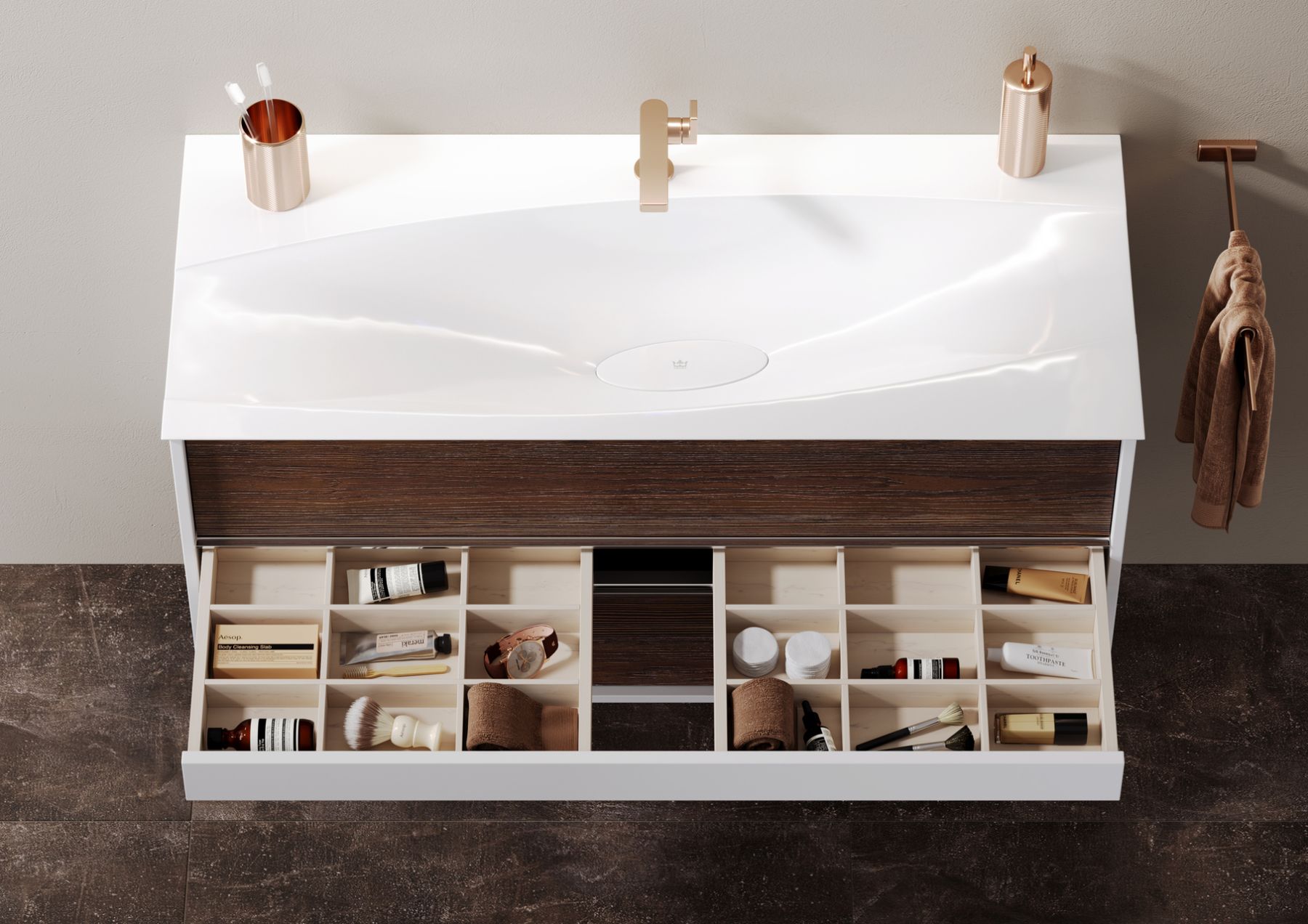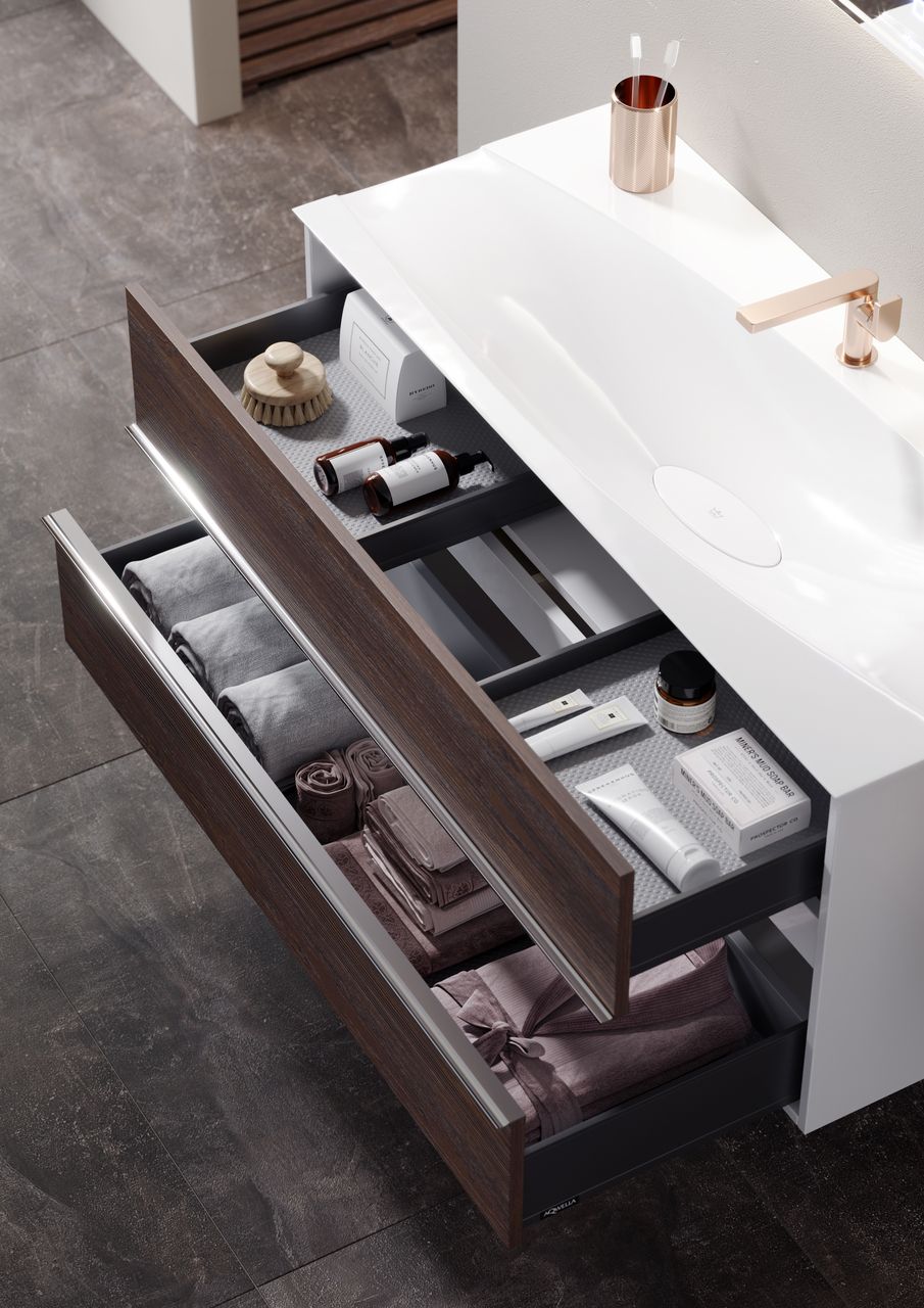 Центральный ящик с системой открытия push-to-open, внутри оснащен системой организации пространства из натурального дерева.