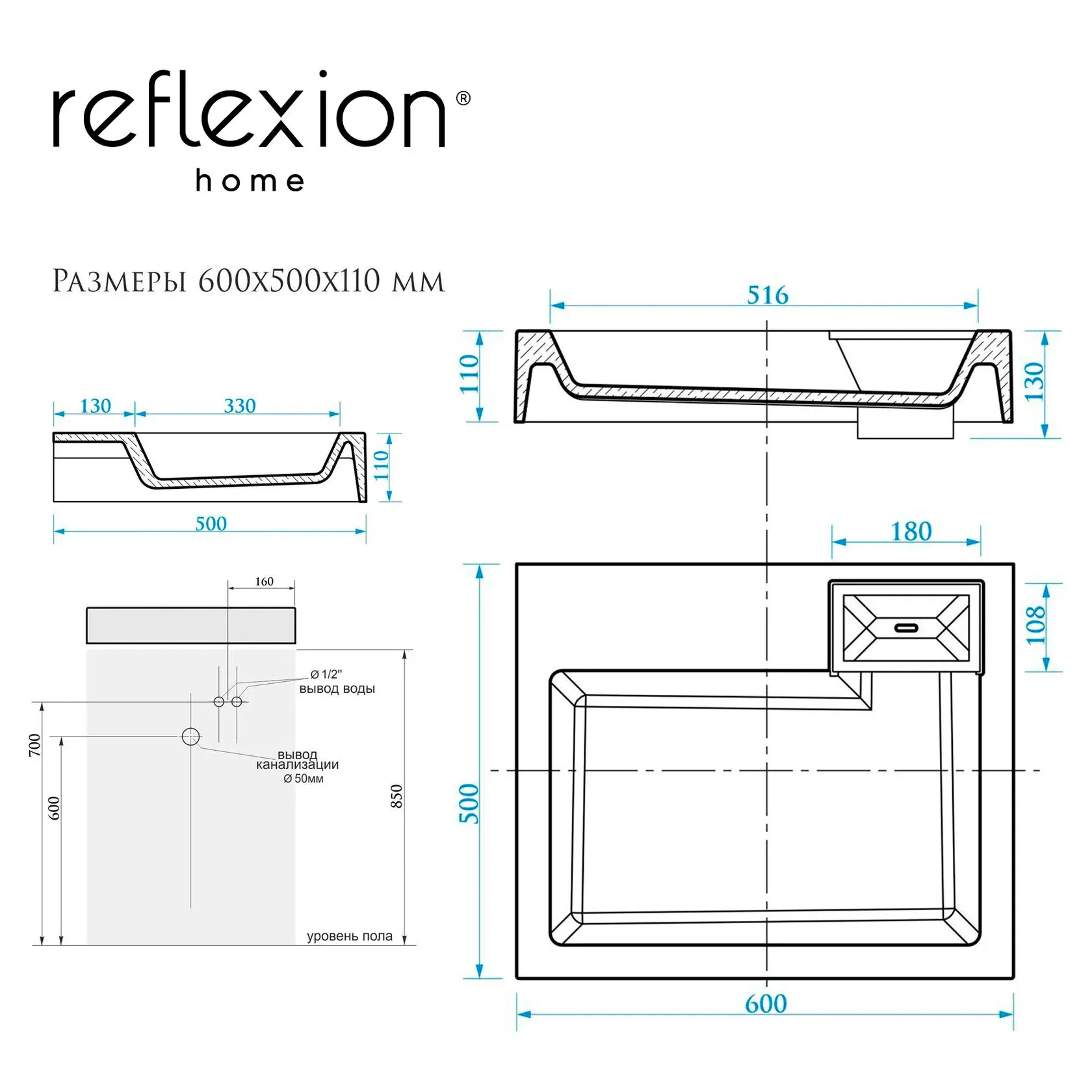 Раковина Reflexion Tetra спроектирована специально для установки над стиральной машинкой. Она имеет неглубокую чашу и горизонтальный слив. Благодаря ему умывальник из искусственного мрамора для ванной комнаты отводит воду в сифон, который проходит позади стиральной машины. Это защищает технику от случайных утечек.