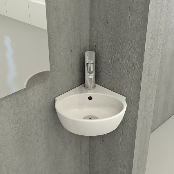 Подвесная раковина из санфарфора Berges Small размером 31,5х30х9,5 см.Угловая, с отверстием под смеситель, глянцевая белая.Крепеж в комплекте. Подходит для использования на столешнице.