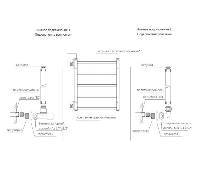 - Поверхность – глянцевая, плазменная полировка (12 класс). Подключение 2 х 1/2" (внутренняя резьба) нижнее, в торцах коллекторов.