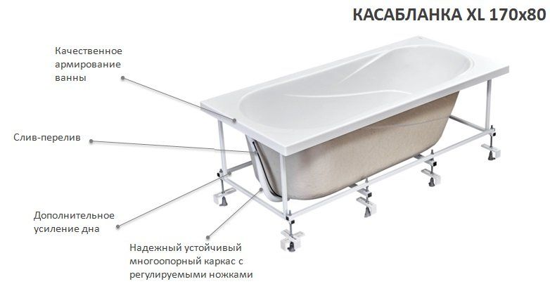 Акриловая ванна Santek Касабланка XL 170х80 прямоугольная модель отличается удобной вместительной формой чаши и эргономичным дизайном. Идеальный вариант для просторной ванной комнаты. Изготовлена методом термовакуумной формовки из 100% литьевого акрила Altugres (Франция) толщиной 5 мм. Использование акрила без примесей обеспечивает длительную эксплуатацию ванны без опасности расслоения. Белоснежный цвет ванны Santek идеально сочетается с другими керамическими изделиями, акрил устойчив к механическим и химическим воздействиям, обладает антибактериальными свойствами и легок в уходе. Безопасность изделия подтверждается серией тестов в соответствии с международными требованиями. Ванна для пристенного монтажа, устанавливается на каркас. Стальной профиль с антикоррозийной обработкой и жесткий несущий каркас обеспечивают устойчивость и надёжность каждой модели ванны.Водоизмещение (л): 210