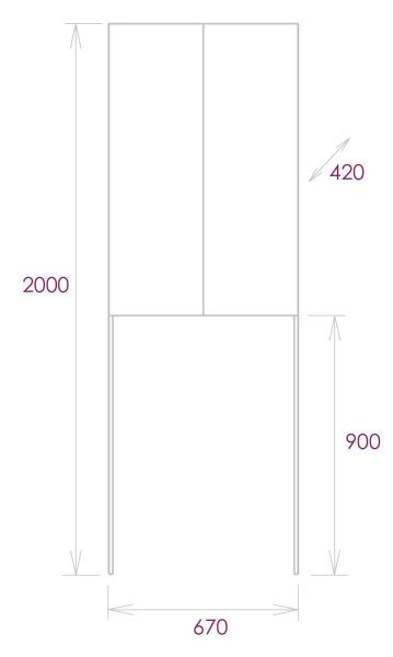 Шкаф представляет собой высокую конструкцию с двумя распашными дверцами, за которыми скрываются вместительные широкие полки, а внизу предусматривает нишу для встройки бытовой техники.