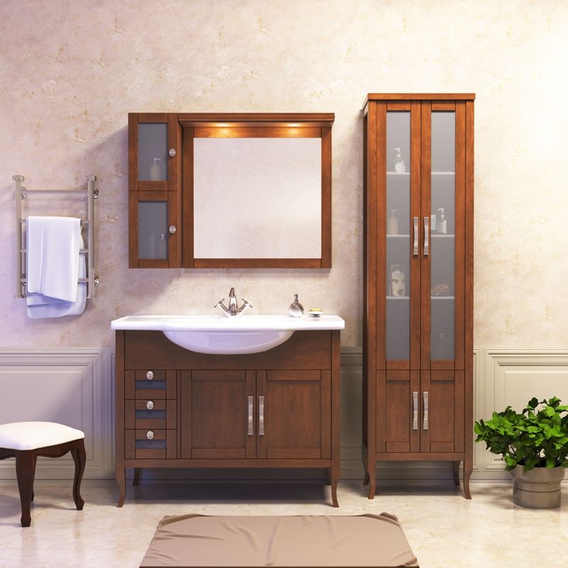 Модельный ряд коллекции МИРАЖ выполнен в двух вариантах — 100 см и 120 см, а также снабжен оригинальными дополнительными решениями для хранения: напольные комод, одностворчатый и двустворчатый пеналы, зеркала с дополнительными навесными шкафами.