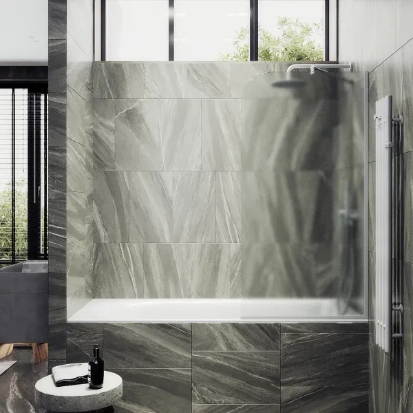 Монтаж осуществляется с помощью алюминиевого профиля, что обеспечивает надежность крепления и безопасность использования стеклянной перегородки для ванной. Также, шторка оснащена специальным уплотнителем, который предотвращает попадание воды на пол ванной комнаты. Закаленное стекло, цвет Графит, толщина 8 мм 1400х500 мм - 1 шт.