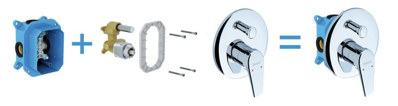 RB 070.50 Встраиваемый механизм, который сводит к минимуму риск повреждения смесителя скрытого монтажа при монтаже или неправильной установке в стену. Работа по установке основного корпуса менее трудоемкая, более быстрая и результат ее значительно лучше. Пластиковый корпус защищает внутреннюю часть смесителя при встраивании в стену, а также облегчает все манипуляции.