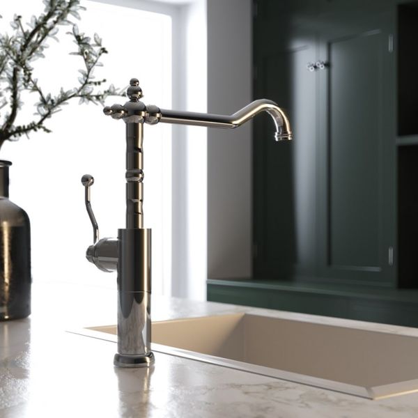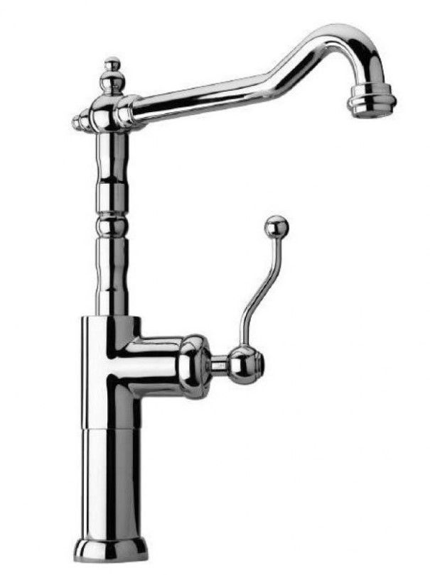 Однорычажный высокий смеситель в винтажном стиле украсит кухню, его поворотный длинный излив позволят менять направление потока воды, а увеличенная высота - использовать глубокую посуду. Изысканная форма позволит сделать смеситель самостоятельным арт-объектом на кухне. Антикварные изгибы DUOMO будут органично смотреться в стилях классика, винтаж или по-новому раскроют интерьер в стиле фьюжн.