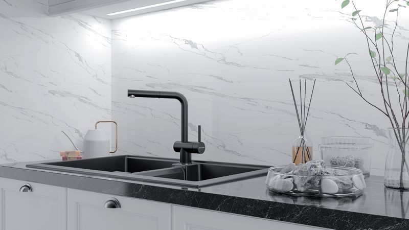 Конструкция смесителя с вытяжным шлангом значительно облегчает процесс мойки посуды или продуктов любого размера и формы.