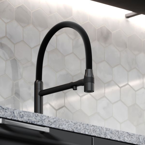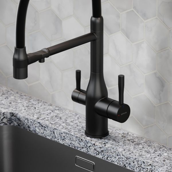 Смеситель для кухни SANCOS Garda с гибким изливом и возможностью подключения фильтра для воды, цвет матовый черный, арт. SC4009MBФункция "Холодный старт" - при включении смесителя активируется холодной поток, для экономии горячей водыАэратор, гибкая подводка, ключ и крепления для монтажа