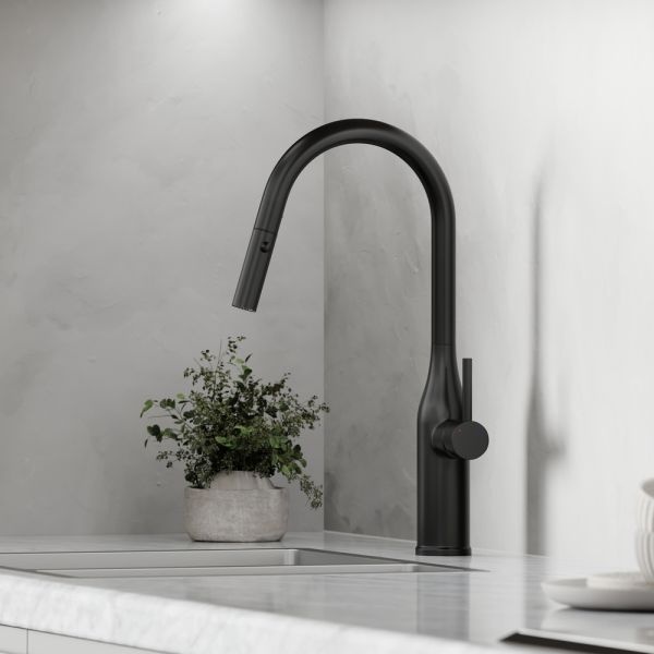 Смеситель для кухни SANCOS Grand c вытяжным и поворотным изливом, цвет матовый черный, арт. SC4002MBС возможностью регулировки температуры водыАэратор, гибкая подводка, ключ и крепления для монтажа, ключ для обслуживания аэратора