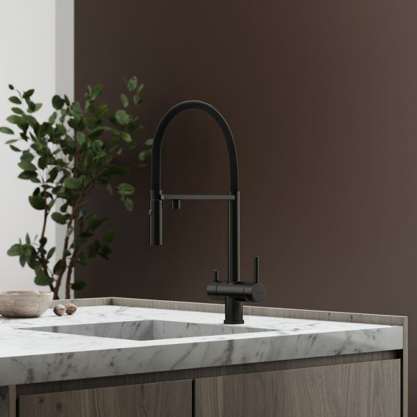Смеситель для кухни SANCOS Imola с гибким изливом и возможностью подключения фильтра для воды, цвет матовый черный, арт. SC4010MBФункция "Холодный старт" - при включении смесителя активируется холодной поток, для экономии горячей водыАэратор, гибкая подводка, ключ и крепления для монтажа
