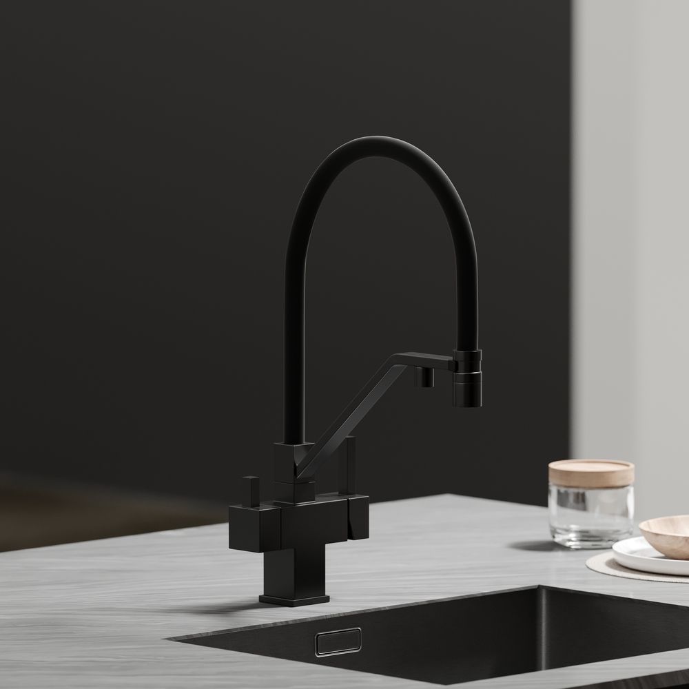 Смеситель для кухни SANCOS Loro с гибким изливом и возможностью подключения фильтра для воды, цвет матовый черный, арт. SC4007MBФункция "Холодный старт" - при включении смесителя активируется холодной поток, для экономии горячей водыАэратор, гибкая подводка, ключ и крепления для монтажа