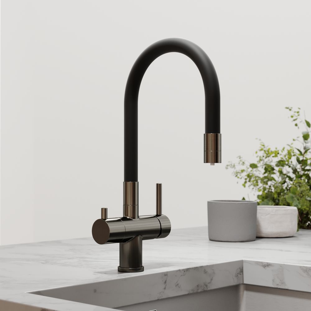 Смеситель для кухни SANCOS Lucia с гибким изливом и возможностью подключения фильтра для воды, цвет вороненая сталь, арт. SC4004GGС возможностью регулировки температуры водыАэратор, гибкая подводка, ключ и крепления для монтажа