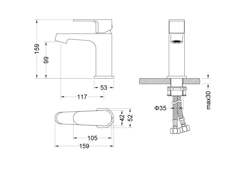 • Однорычажная система регулировки силы струи и температуры воды