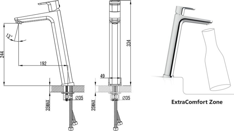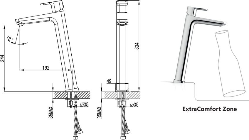 Смеситель для умывальников увеличенной высоты (ExtraComfort Zone) предназначен для умывальников, которые размещаются на столешнице. Для комплексного решения ванной комнаты рекомендуется использовать смесители 10° в сочетании с аксессуарами и другими продуктами концепции 10°. Для наружной очистки рекомендуется использовать RAVAK Cleaner Chrome.